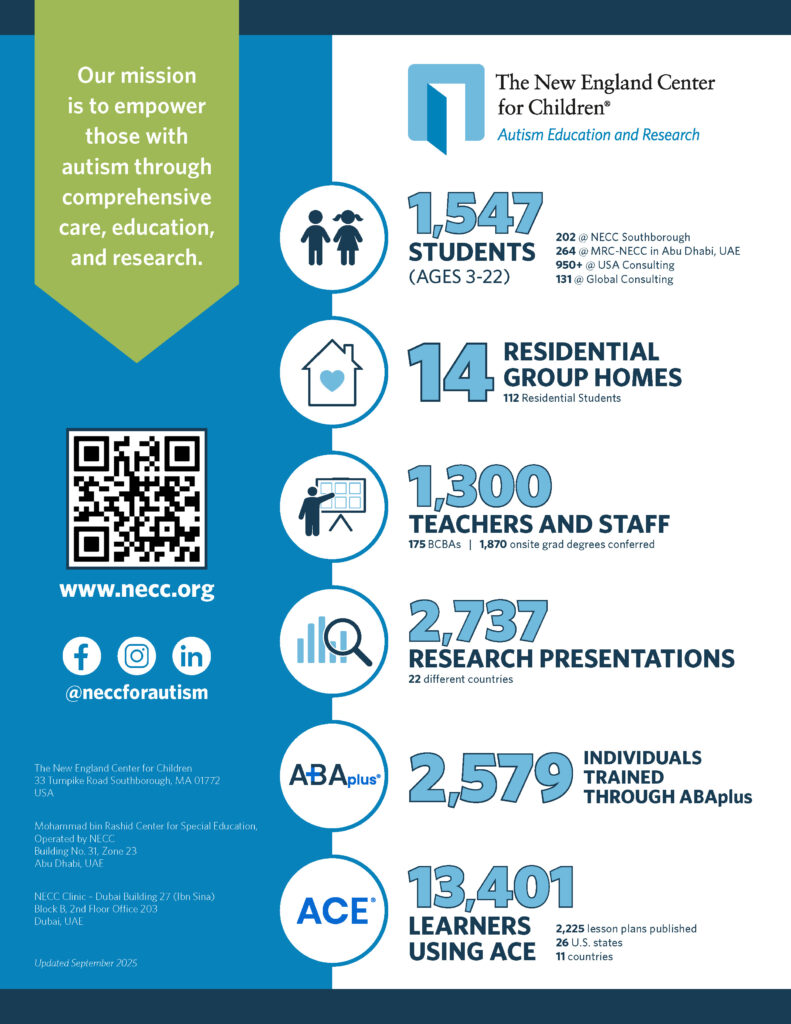 The New England Center for Children (NECC) is a worldwide leader in autism education and research. Through our schools, clinics, consulting services, ACEĀ® ABA Software System, and robust research and training initiatives, we are shaping a more inclusive future for all.