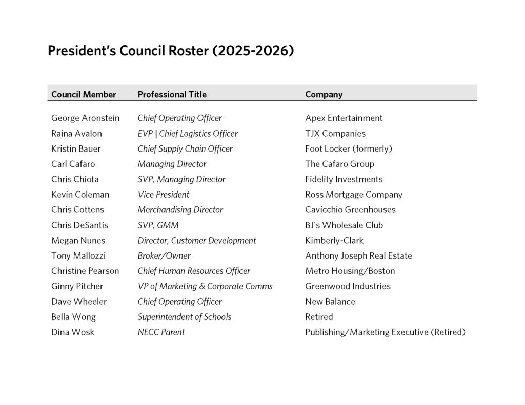 The President’s Council is a volunteer-based group of senior professionals who are passionate about NECC’s mission. Members assist in driving community engagement, revenue generation, and brand awareness to support NECC’s vision.